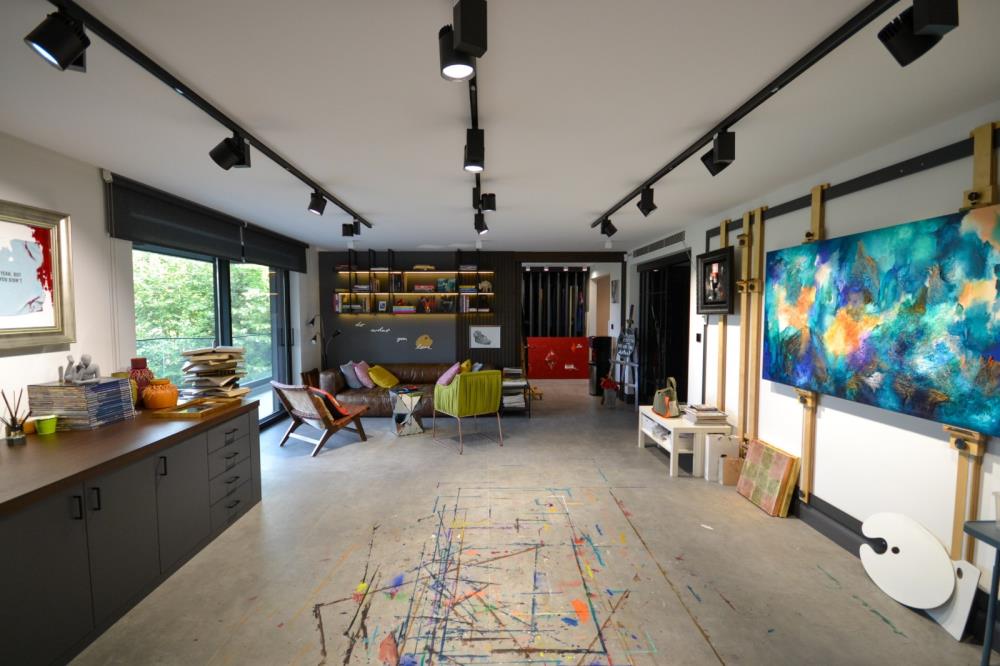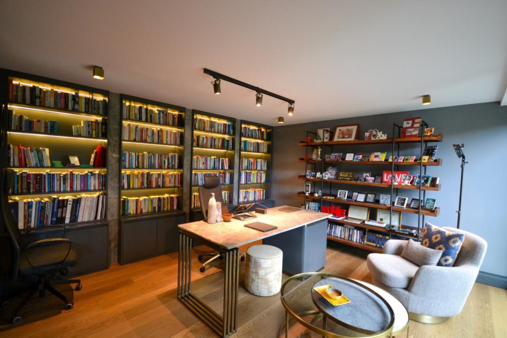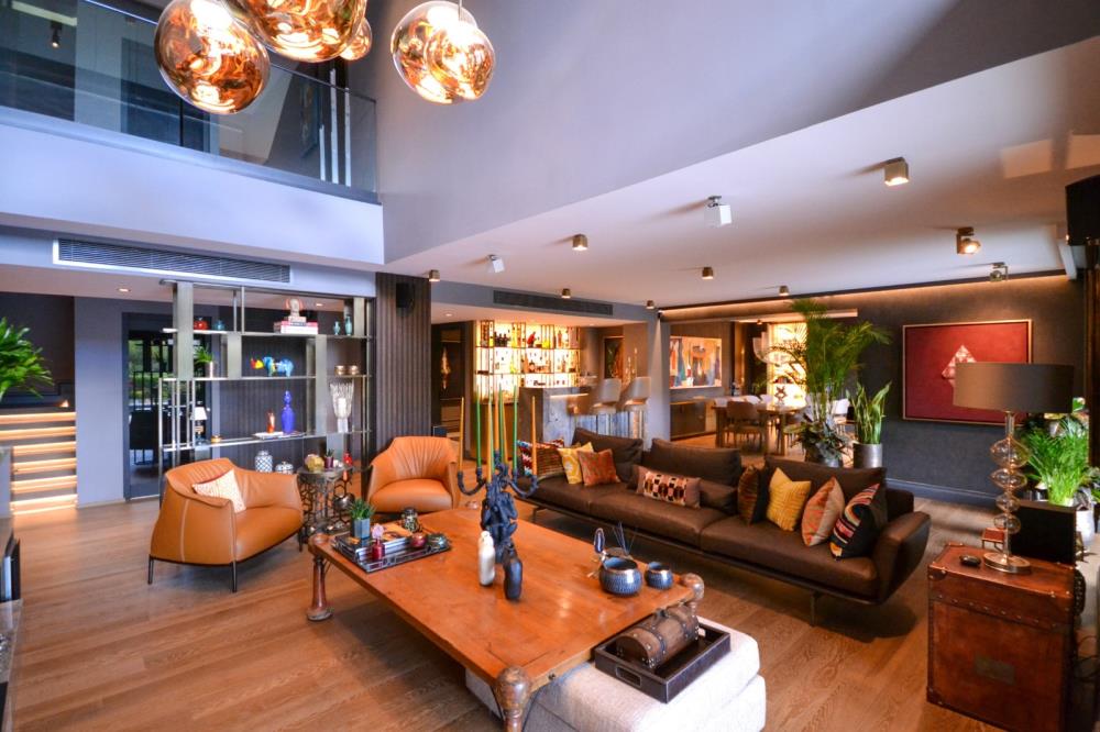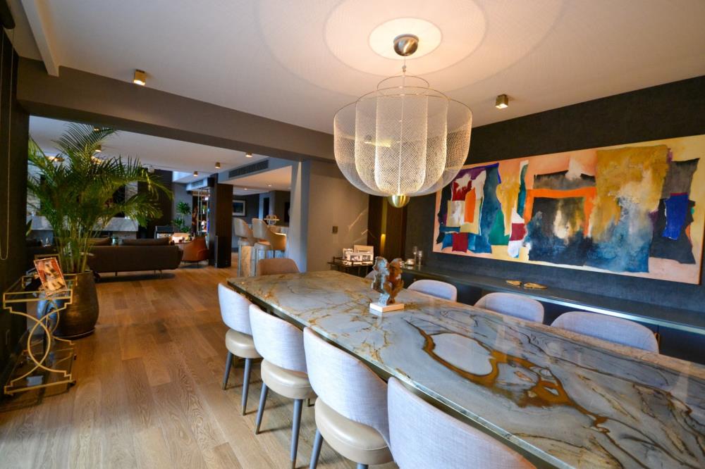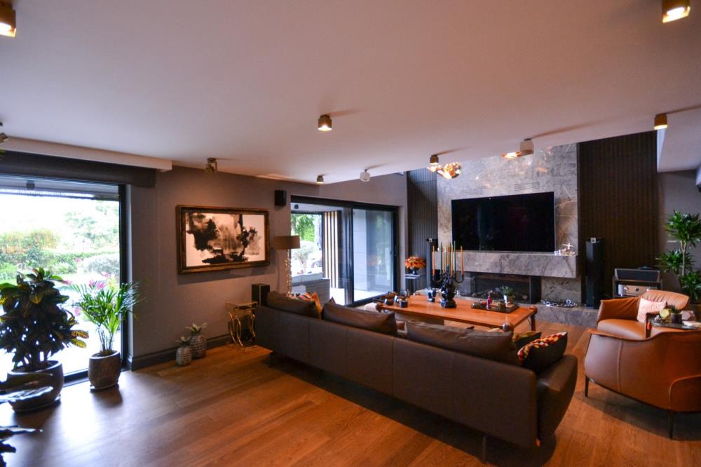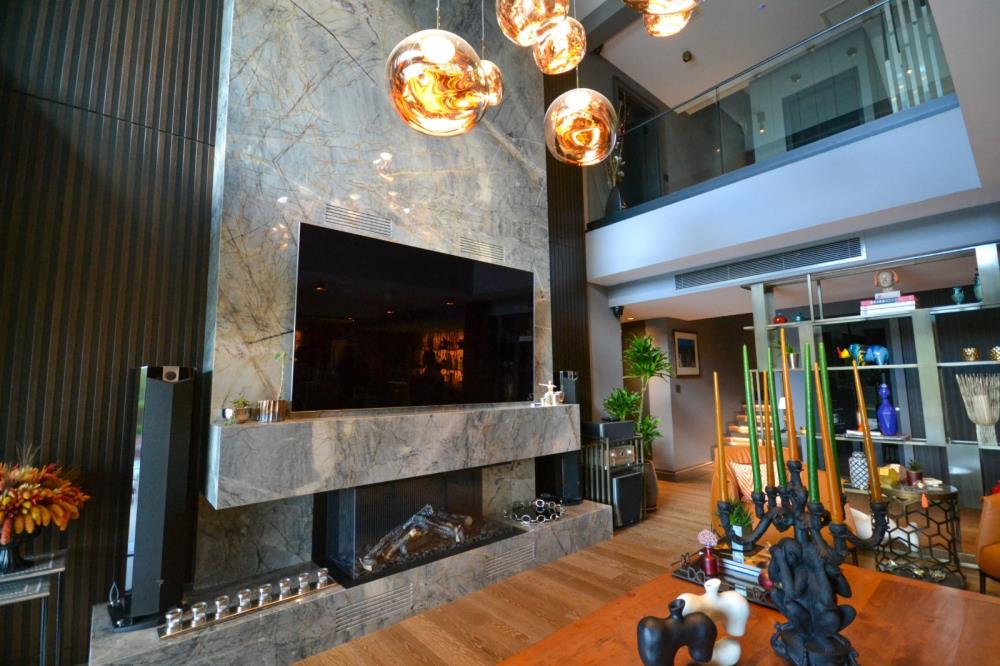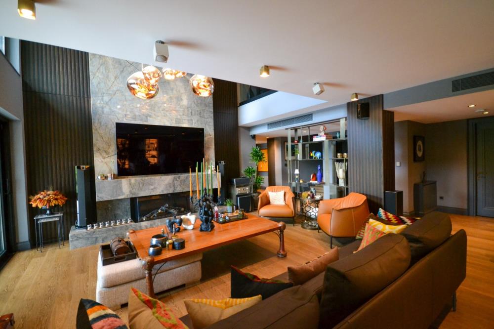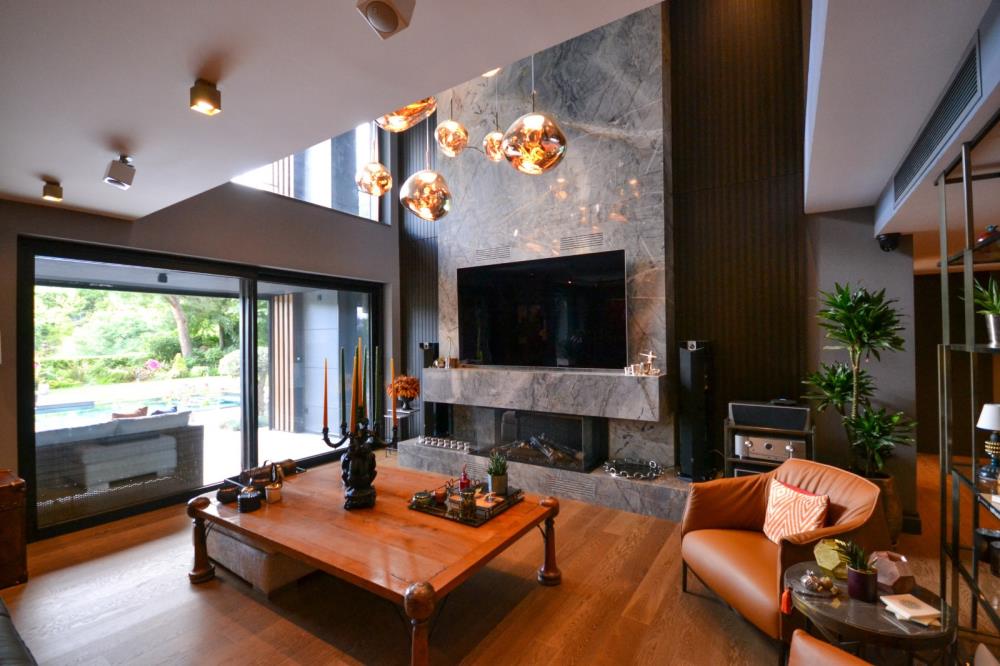 Şömine, TV duvarı 6 metre uzunluğunda su, yemek veya içki lekesi tutmayan ısı dayanıklı çok özel QUARZITE ZELESTE, ve bar ve yemek odası duvarları WHITE GOLDEN ONYX’le tasarlanmıştır. Onyx’ler Philips Hue Led striplerle renkleriyle eşsiz bir görüntü kazanmıştır.