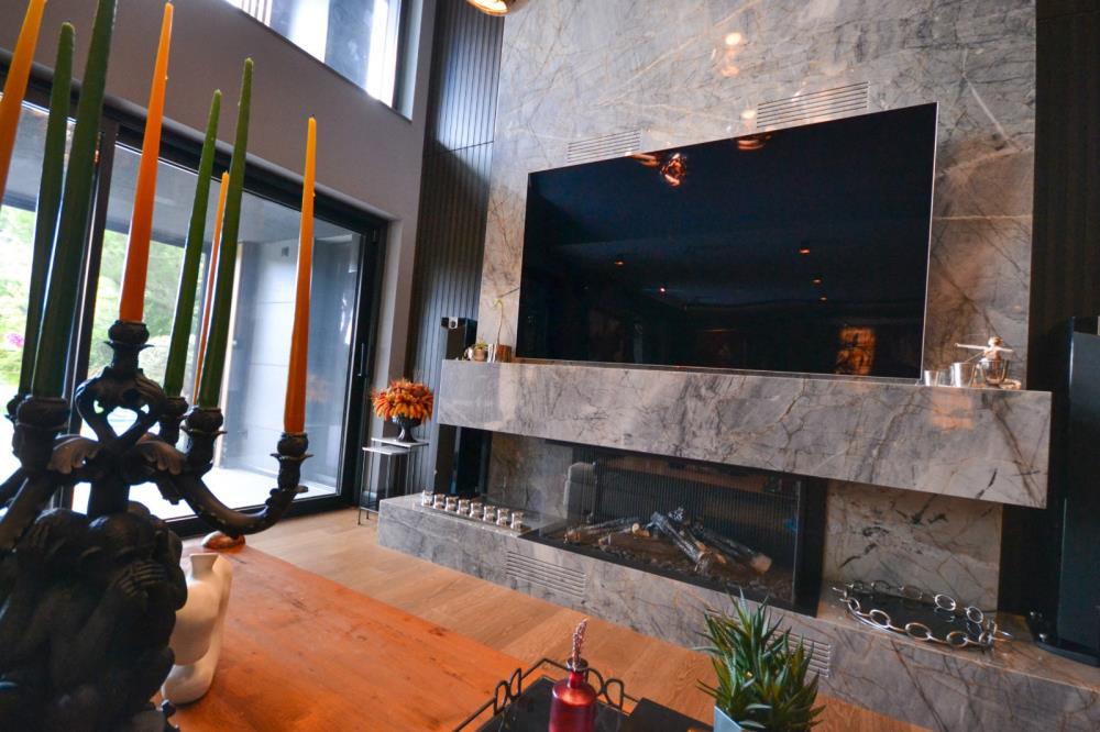 M-Design markasının dünyada benzeri olmayan kendinden ısı izolasyonlu, doğal gazlı olduğu için saniyeler içinde uzaktan kumanda ile yanan ve doğal odun görüntüsü için seramik odunların içine bile brülör bağlantıları konmuş TRUE VISION 1300 H QUATRO modeli uygulanarak doğal şömine keyfi sağlanmıştır.