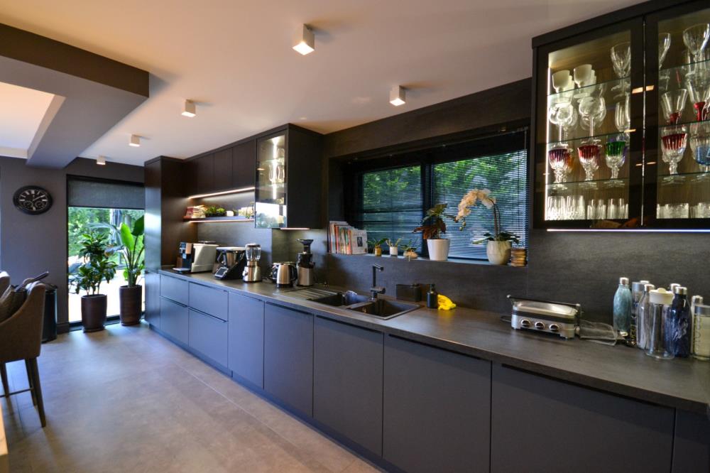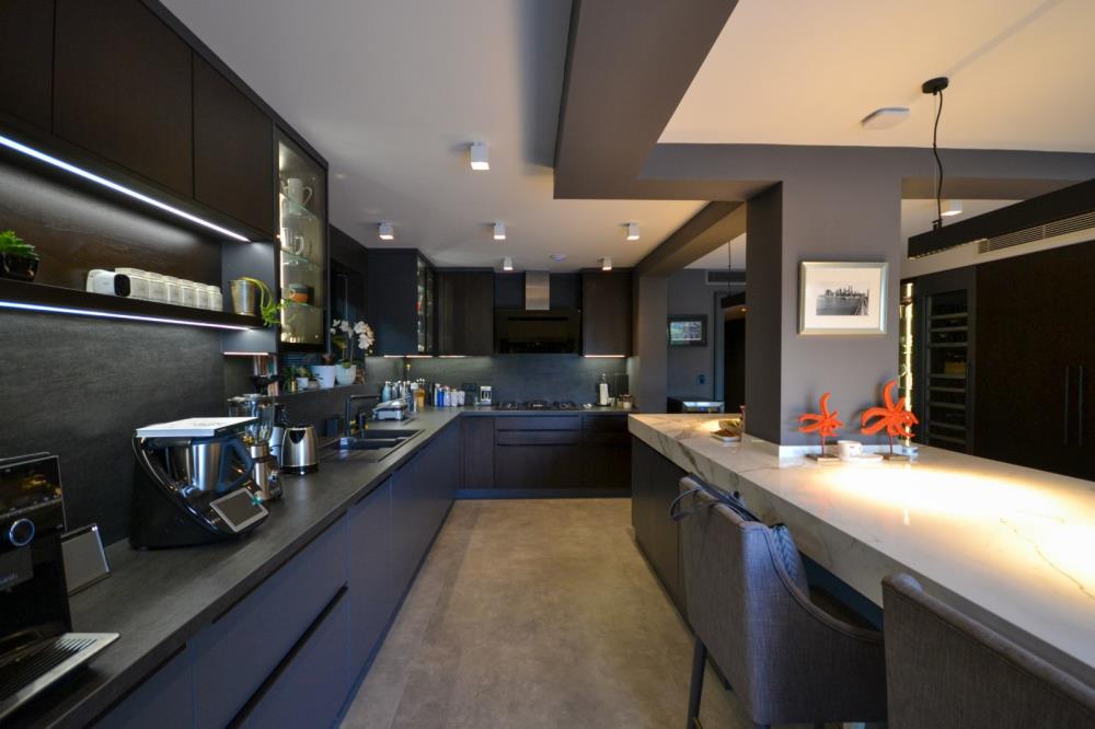 Tüm mutfak tezgahları su, yemek veya içki lekesi tutmayan, ısı dayanıklı çok özel DEKTON BROMO ve porselen Level Stone STATUARIO marka çok özel taşlar kullanılmıştır.